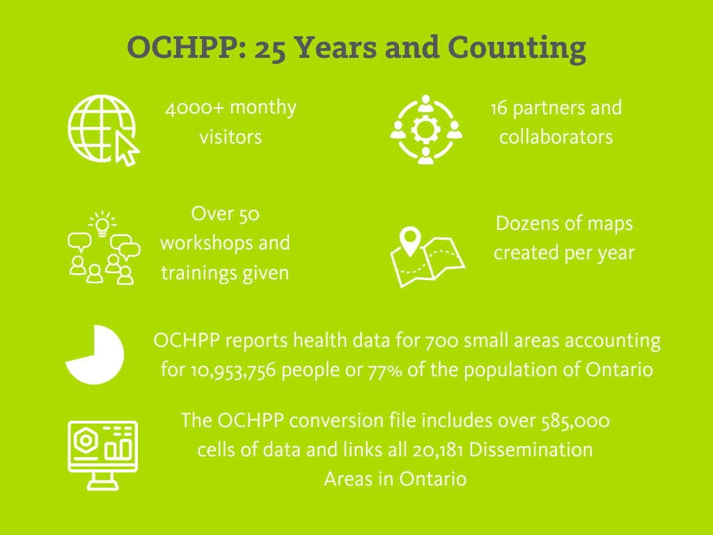 Celebrating 25 years: The Ontario Community Health Profiles Partnership (OCHPP) project celebrated 25 years on November 17, 2023. Thank you to all of our Partners and Colleagues at MAP Centre for Urban Health Solutions and Unity Health Toronto who helped us celebrate a wonderful in-person event! OCHPP by numbers.